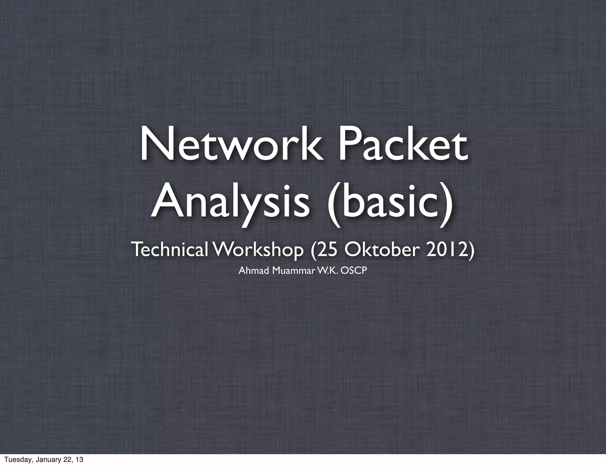 This document summarizes a technical workshop on network packet analysis presented by Ahmad Muammar W.K. OSCP. The workshop covers capturing and analyzing network traffic at different levels, from examining protocol fields to reconstructing files. Challenges like encrypted traffic and incorrect protocol dissection are also discussed. Various Wireshark features are demonstrated including capture and display filters, protocol decoding, and reconstructing files transmitted over non-standard ports.