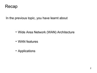 Packet forwarding in WANs involves breaking messages into packets that are transmitted individually and may follow different routes to the destination. There are two types of packet switching networks: virtual circuit networks which set up dedicated routes for connections, and datagram networks which treat each packet independently. WAN addresses use a hierarchical structure to simplify forwarding, with some bits identifying the packet switch and others identifying the connected computer. Packet switches use routing tables containing next-hop forwarding information to route packets towards their destination based on the address without knowing the complete network topology.