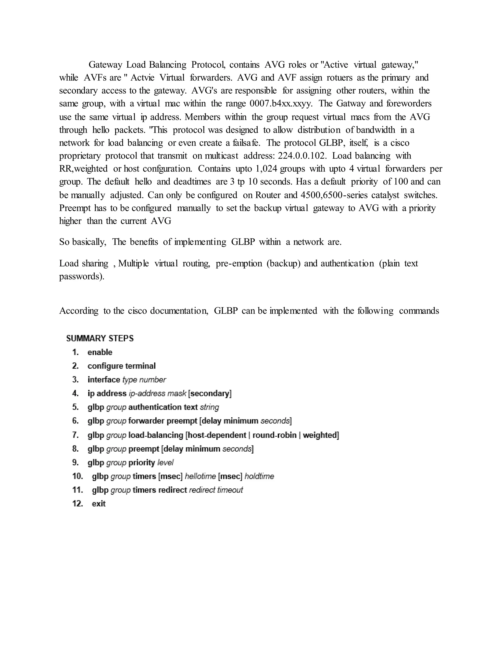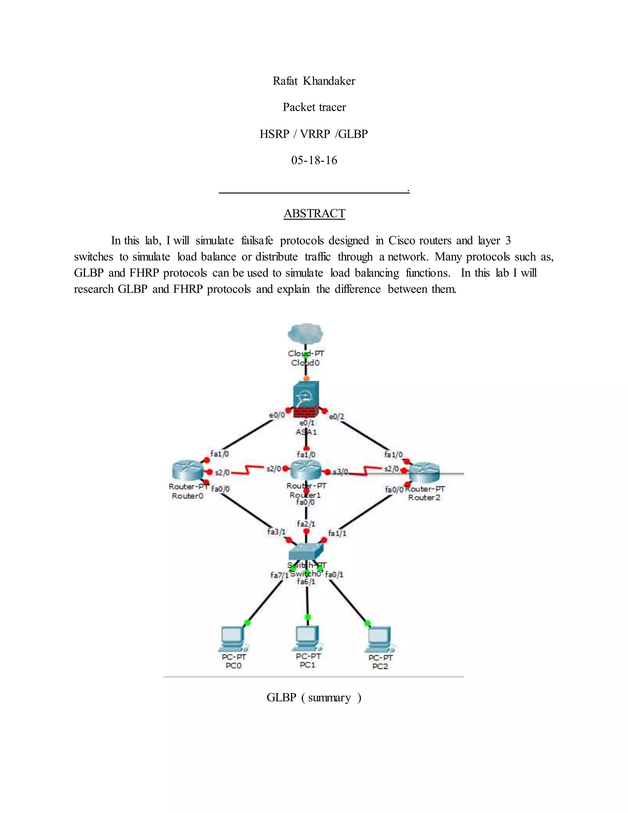 This document discusses simulating failsafe protocols like GLBP and FHRP to provide load balancing and redundancy. It provides an overview of GLBP, explaining that it uses Active Virtual Gateways and Active Virtual Forwarders to assign routers as primary and secondary access to the virtual gateway IP. It also discusses FHRP protocols like HSRP and VRRP, noting that HSRP is Cisco proprietary while VRRP is an IETF standard. The document goes on to describe configuring GLBP across three routers to demonstrate how traffic would be load balanced and how a backup router would take over if the primary fails.