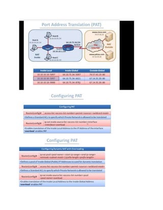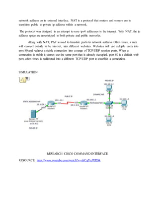 This document provides an introduction to Network Address Translation (NAT) and describes a simple simulation configured to allow hosts from a private network to access a server through its public IP address. NAT is designed to separate private IP addresses from public IP addresses. The simulation involves configuring two routers, with one router using static NAT with Port Address Translation (PAT) to allow a server to be accessed via its public IP, and the other router using dynamic NAT and PAT to allow multiple private IPs to access the network. This demonstrates how NAT can translate private network addresses to access resources externally using public IP addresses.