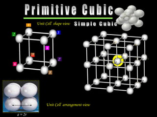 This document discusses the four types of unit cell arrangements in crystals - primitive, body centered, face centered, and end centered. It also examines coordination numbers, packing fractions, radius ratios, and the relationships between unit cell shape and sphere arrangement. Key details covered include that primitive unit cells have a coordination number of 6, face centered unit cells have the highest packing fraction of 74%, and different radius ratios correspond to specific coordination numbers.