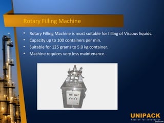 Unipack Technologies Pvt. Ltd. specializes in various automated packing and conveying systems, including rotary filling machines, screw capping machines, and heat sealing machines, all designed for high efficiency and low maintenance. Their machines accommodate different container sizes, handle up to 120 containers per minute, and include features such as automatic cap feeding and adjustable speeds. The company provides a range of equipment suitable for both small and large production needs in the packaging industry.