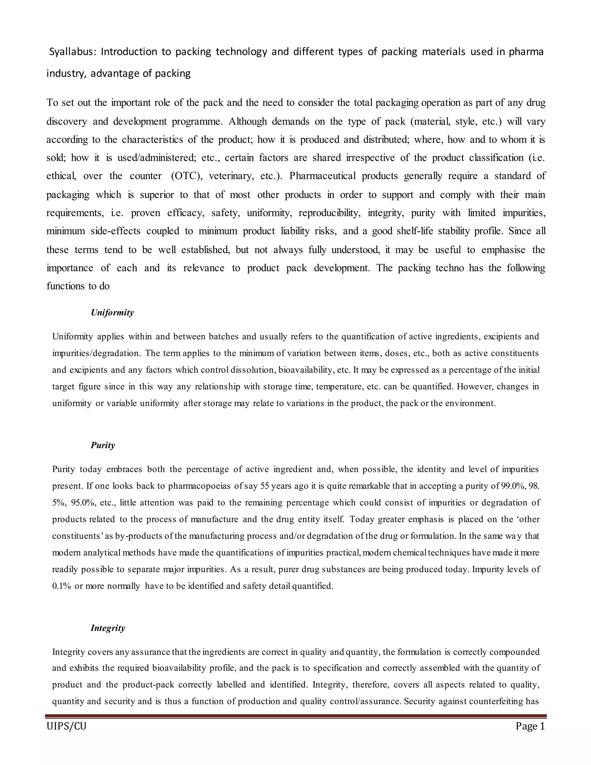 The document discusses the importance of packaging for pharmaceutical products. It outlines several key functions of packaging including uniformity, purity, integrity, minimizing side effects, and ensuring stability and a defined shelf life. It also classifies different types of packaging materials like primary, secondary and tertiary packaging. Specific materials that are used include glass, plastics, polyethylene, polypropylene, and others. The role of packaging technology in preventing counterfeiting is also covered through various techniques like ink technology, RFID tags, tamper-evident stickers, and holograms. Packaging can also help promote patient compliance and provide informative labeling.