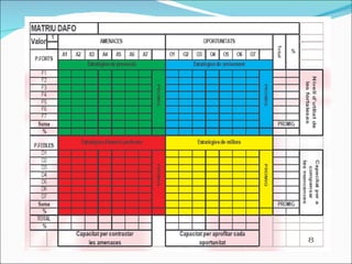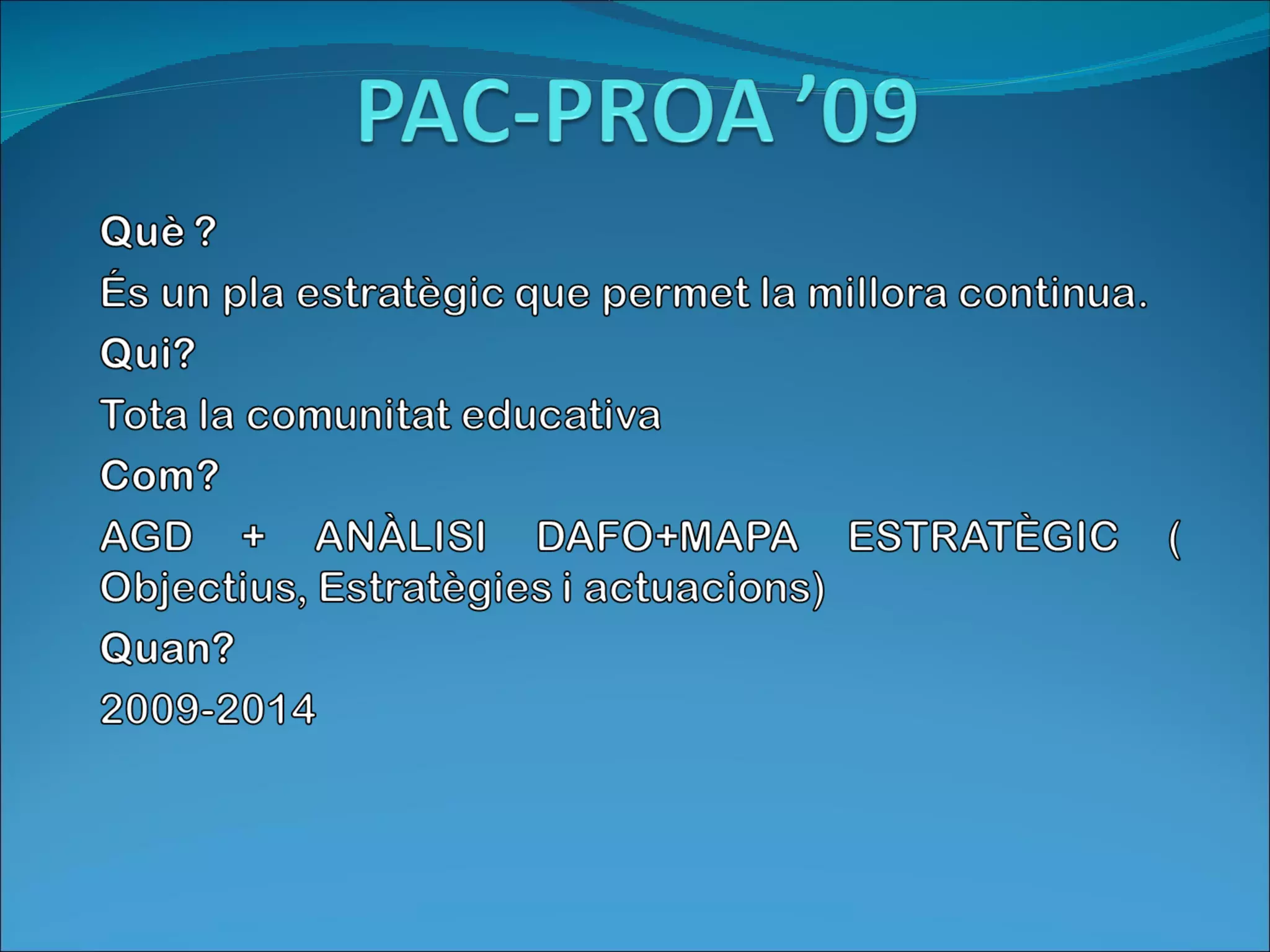 DAFO A menacesMolta diversitat socio-cultural O portunitats Participació en el Pla estratègic D ebilitats Manca de formació per atendre diferents ritmes d’aprenentatge dins de l’aula. F ortaleses Claustre il.lusionat, treballador i amb ganes d’aprendre.