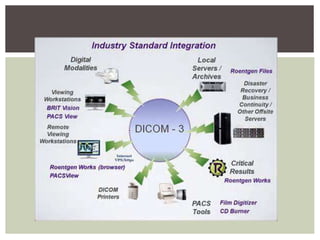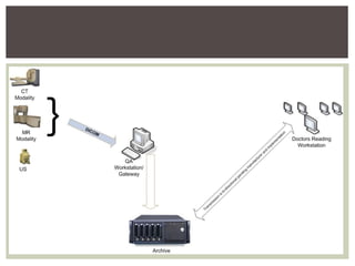 PACS (Picture Archiving and Communications System) is a medical imaging technology that provides economical storage and access to images from multiple modalities. It began development in the 1950s and was further advanced by the military in the 1980s. PACS replaces film storage with electronic images that can be accessed from various workstations and remotely. It consists of imaging modalities, a network, workstations, and archives. PACS provides benefits like hard copy replacement, remote access, and integration with other medical systems, but high costs and need for training were initial disadvantages.