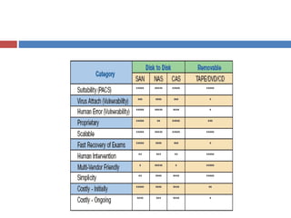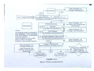 The document outlines the architecture of Picture Archiving and Communication Systems (PACS), highlighting the need to consider both current and future challenges due to the dynamic nature of technology and organizations. It compares distributed and centralized models of PACS architecture, detailing aspects such as operational fit, scalability, and integration with other hospital systems. Additionally, it mentions various storage solutions like SAN, NAS, and CAS as part of the architecture's evolution.