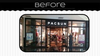The document summarizes the process of redesigning the window displays for the men's and women's sections of a Pacsun store. It describes the inspiration, planning process, elements incorporated, and before and after photos of each display. Key points included inspiration from current trends, creating outfits targeting different consumer types, use of lighting, color schemes, props and decorations appropriate for the holiday season, and incorporating feedback from the store manager. The team worked to apply their knowledge while maintaining Pacsun's store image and found it challenging at times to separate personal preferences from corporate instructions.