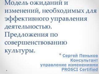 Документ описывает модель PACT (поведение, ориентированное на производительность, ответственность, ориентированность на клиента и командную работу) для эффективного управления работой команд и внедрения изменений в организационной культуре. Он акцентирует внимание на важности установки четких ожиданий, регулярной обратной связи и примеров корректного и некорректного поведения как для лидеров, так и для членов команды. Основная мысль заключается в том, что успешные изменения требуют соответствия нормам поведения и активного взаимодействия в команде.