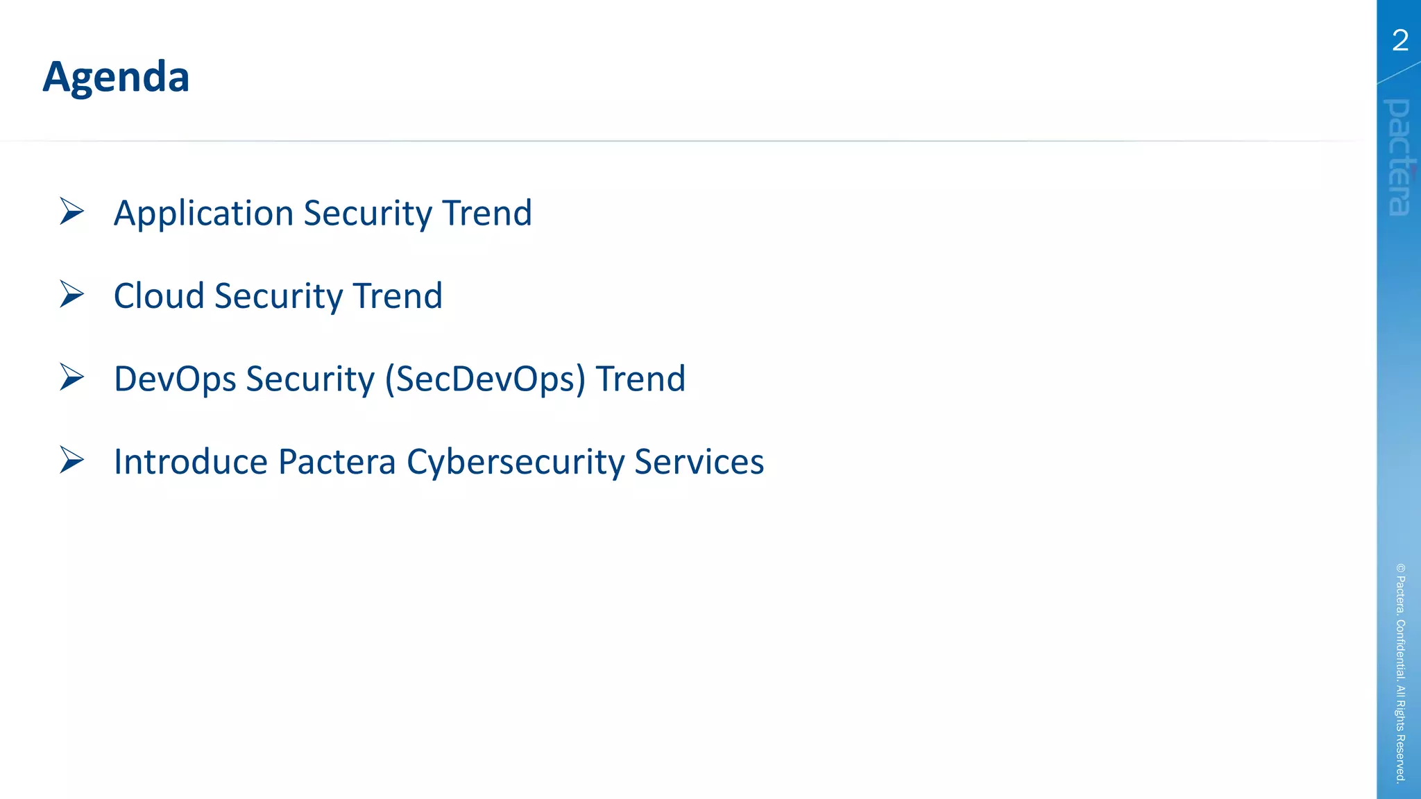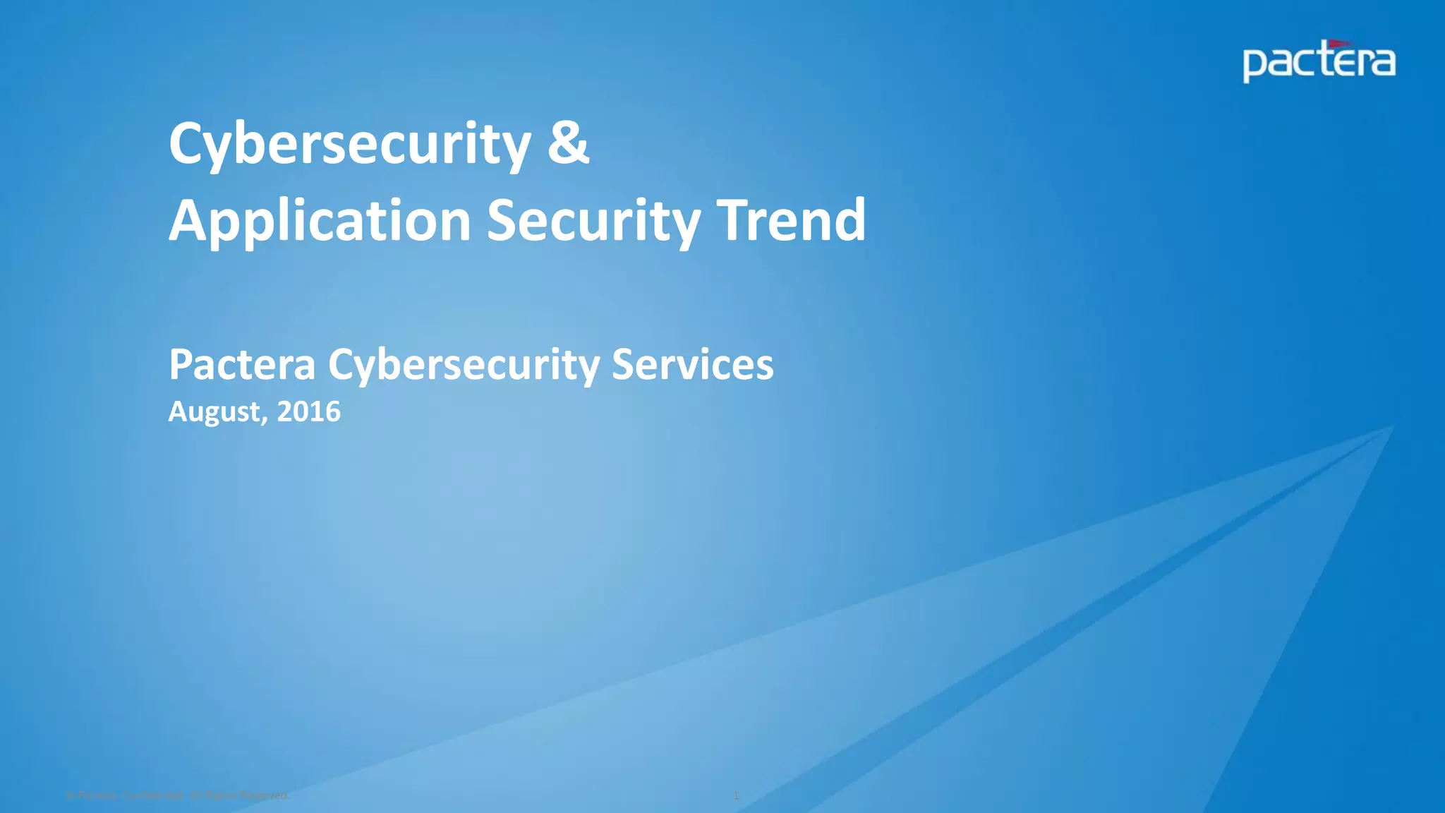 This document summarizes cybersecurity trends from surveys conducted in 2016. It finds that 38% of organizations have a maturing application security program, while 41% cited public-facing web applications as the leading cause of breaches. Regarding cloud security, 79% of respondents are implementing or using cloud environments actively, with infrastructure as a service being the most popular service. The document also introduces Pactera's cybersecurity services capabilities, which include application security testing, secure development training, and third-party risk management.