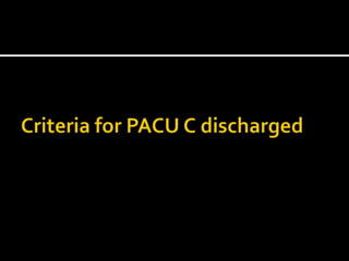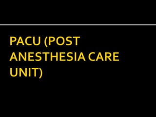 1. The document outlines a post-anesthesia care unit (PACU) scoring system to assess patient recovery and determine readiness for discharge. It assesses 5 areas: activity, respiration, circulation, consciousness, and color.