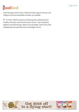 1. This recipe provides instructions for making Pad Thai, a classic Thai stir-fry dish. It involves soaking rice noodles, stir-frying vegetables like garlic and spring onions, cooking an egg, then combining everything with cooked prawns, beansprouts, and the noodles and seasoning them with a mixture of tamarind paste, fish sauce, and sugar.