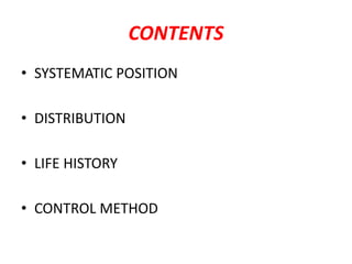 This document discusses two pests that damage paddy/rice crops: the rice bug (Leptocorisa varicornis) and the brown plant hopper (Nilaparvata lugens). It provides details on the systematic classification, distribution, life cycle and damage caused by each pest. It also outlines control methods for each pest, including cultural, chemical and mechanical approaches. The goal is to educate readers on these two major rice pests and how to effectively control them to prevent crop loss.