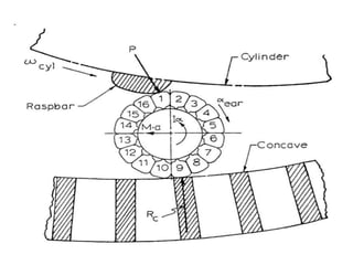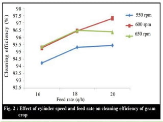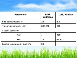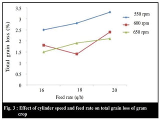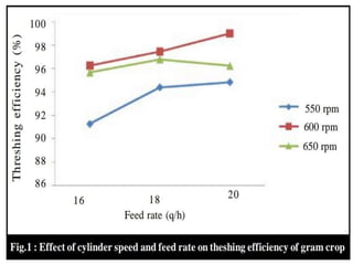 This document provides specifications for several agricultural threshing machines. It describes a paddy thresher that consists of a feeding chute, threshing cylinder, blower, and grain and straw outlets. It is made of steel and powered by a 5 hp engine. It also describes a sunflower thresher with a 65 cm diameter threshing cylinder and cleaning system. Further, it provides details on a maize dehusker-cum sheller that uses staggered pegs and sieves to separate husks from shelled maize. Charts are also included showing the effects of cylinder speed, grain moisture, and feed rate on threshing efficiency and grain loss.