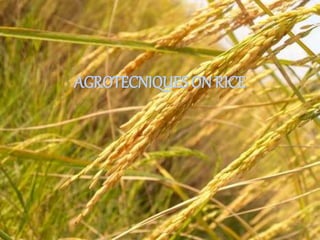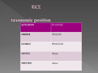 This document provides information on rice cultivation techniques. It discusses the taxonomy of rice, important rice growing regions and production statistics. It describes rice varieties grown in different seasons and soil types in India. The document covers rice cultivation methods, fertilizer management, water requirements, weed control, harvesting practices and average yields. It also discusses the System of Rice Intensification technique which uses less seed, water and chemicals.