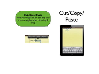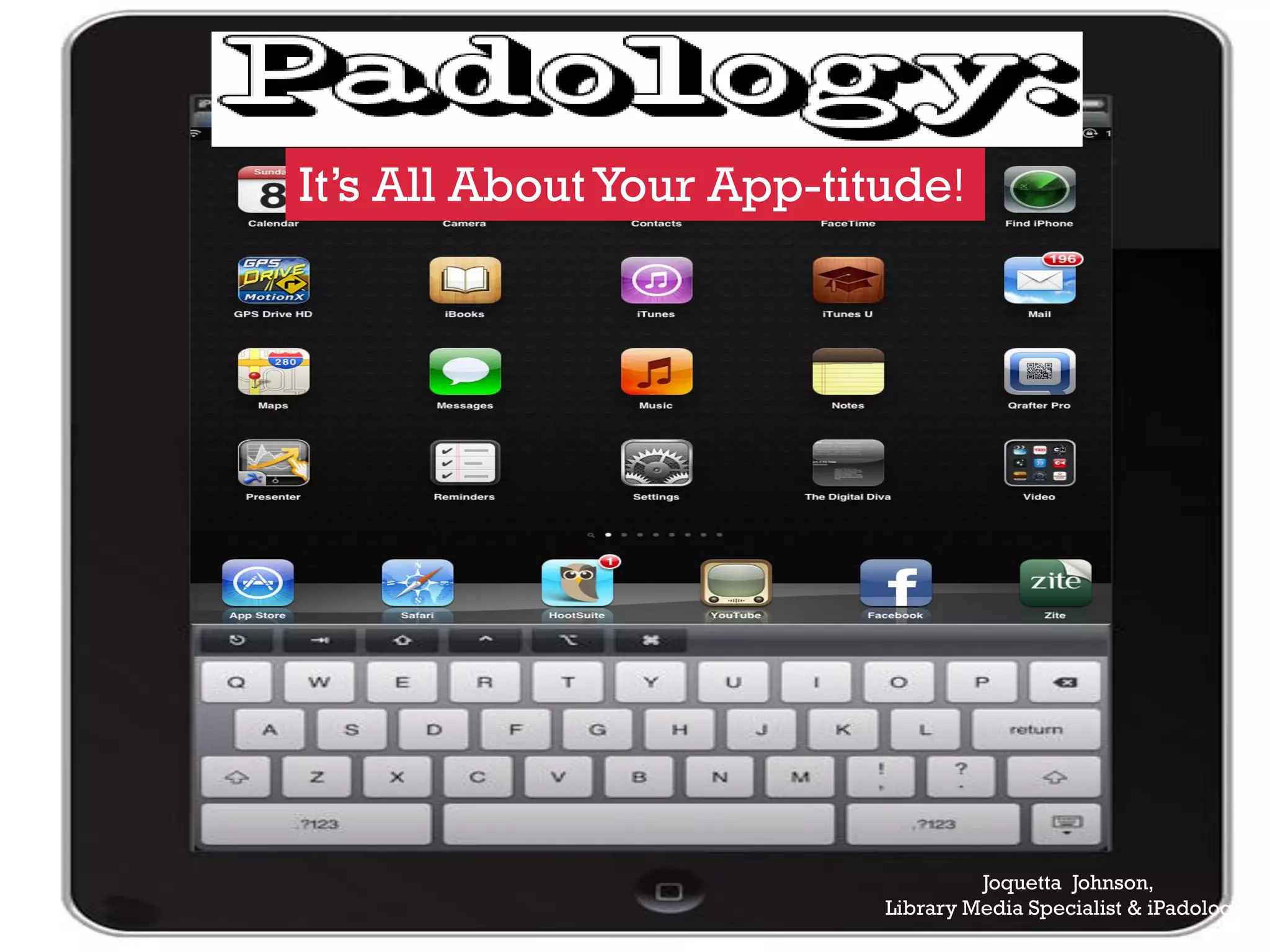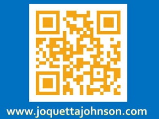 This document provides an overview of an iPad training session presented by Joquetta Johnson. It begins with Johnson introducing herself and her experience and credentials. The agenda for the session is then outlined, covering getting to know the iPad, tips and tricks, accessories, and teaching and learning apps. Recommended apps are listed in various categories. The session concludes with Johnson providing her contact information and digital footprint.