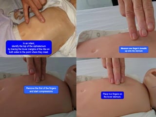 Paediatric basic life support (PBLS) involves procedures to prevent anoxic brain damage by promoting return of spontaneous circulation and breathing in children. It entails checking response and breathing, then pulse, and performing cycles of chest compressions and rescue breaths in a ratio of 30:2 for one rescuer or 15:2 for multiple rescuers. Key considerations include maintaining an open airway with head tilt and jaw thrust maneuvers rather than finger sweeps, and compressing 1/3 the depth of the chest's anterior-posterior diameter at a fast rate of 100/min until signs of life return, help arrives, or exhaustion occurs.