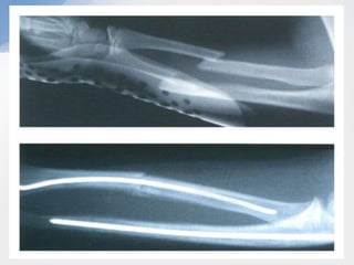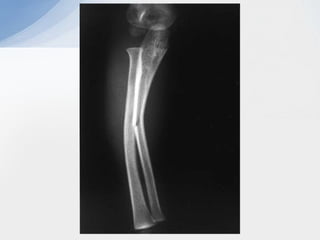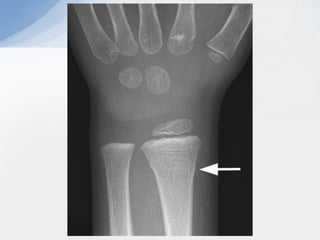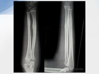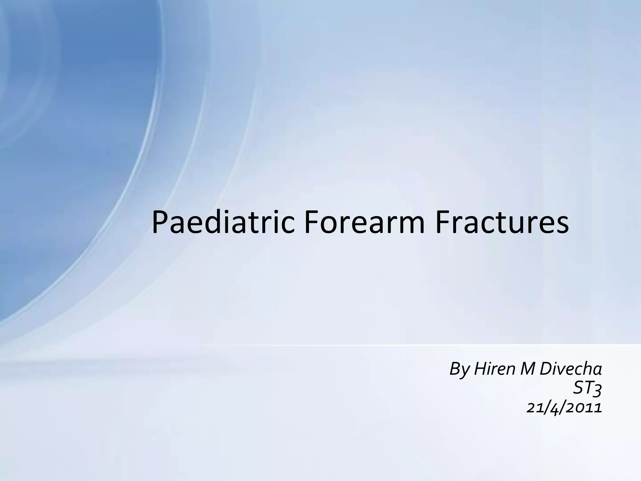 This document summarizes paediatric forearm fractures. [1] Forearm fractures are common in children, often resulting from falls or sports injuries. [2] Clinical examination focuses on pain, swelling, deformity and neurological status. [3] Treatment depends on fracture type and aims to restore function while allowing healing with minimal deformity. Conservative treatment is usually sufficient but surgery may be needed for more complex fractures.