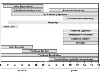 The document outlines the Paediatric Rome IV criteria developed for diagnosing functional gastrointestinal disorders in children and adolescents. It details various disorders such as infant colic, rumination syndrome, and irritable bowel syndrome, providing specific diagnostic criteria for each. The Rome IV criteria emphasize a shift from a physiologically based classification to a symptom-based approach to improve diagnosis and treatment globally.