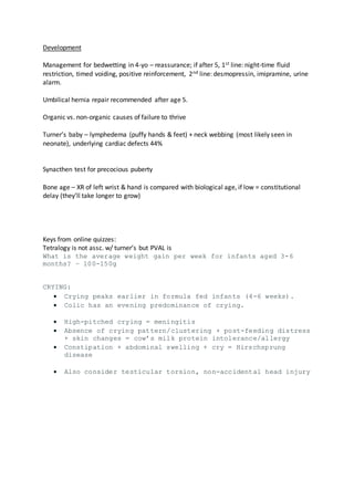 This document provides guidance on managing bedwetting in 4-year-olds and discusses testing for conditions like precocious puberty, Turner's syndrome, and failure to thrive. It also reviews normal infant weight gain, crying patterns that could indicate underlying issues, and ranges to know like stridor.