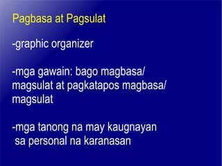 Ang dokumento ay naglalaman ng mga estratehiya at aktibidad para sa pagbasa at pagsulat, kasama na ang paggamit ng graphic organizers, mga tanong na may kaugnayan sa personal na karanasan, at talasalitaan. Nakatuon ito sa interaksyon ng mga mag-aaral, guro, at komunidad upang mapabuti ang pagkatuto, at naglalaman din ng mga pangkatang gawain at pagsasanay. Tinalakay din ang temang naturalismo sa konteksto ng buhay at pamumuhay sa pamamagitan ng mga kwento at makabagong teknolohiya.