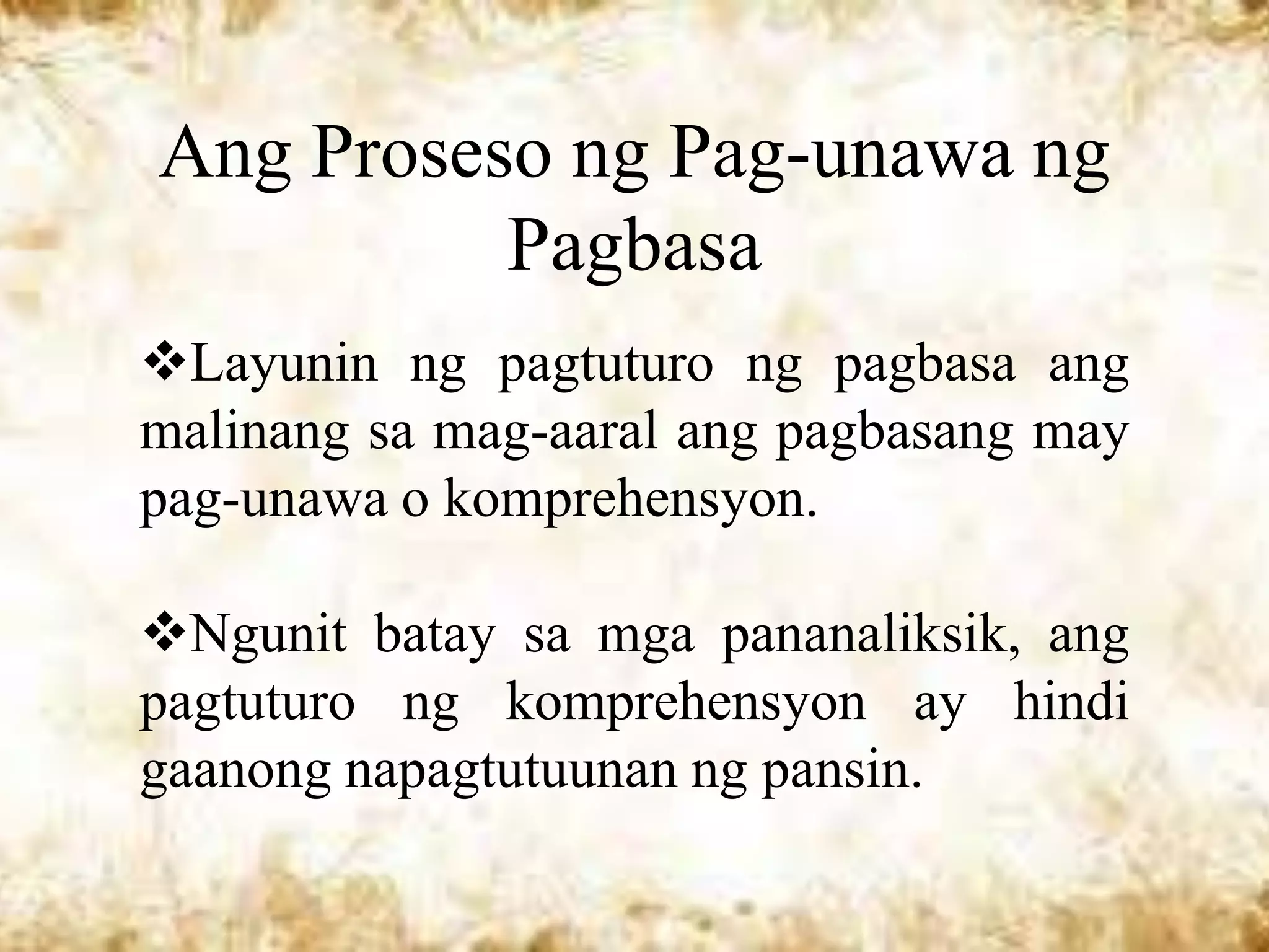 Ang dokumento ay tumatalakay sa teorya at pananaw sa pagtuturo ng pagbasa, na ang layunin ay malinang ang pag-unawa ng mga mag-aaral. Ipinapakita na ang komprehensyon ay proseso ng pag-uugnay ng dating kaalaman sa bagong impormasyon, kaya mahalaga ang aktibong partisipasyon ng mga mag-aaral sa pagbabasa. Ang mga teoryang tinukoy ay nagpapakita ng interaktibong proseso na nagsasangkot ng bottom-up at top-down na pag-unawa mula sa teksto at mula sa karanasan ng mambabasa.