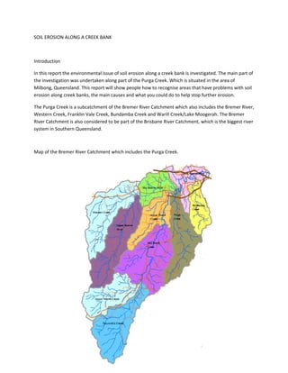 Soil erosion along a creek bank in Milbong, Queensland is investigated. The report examines soil erosion issues along Purga Creek, a subcatchment of the larger Bremer River Catchment. It aims to help people recognize erosion problems, understand the main causes, and take steps to prevent further erosion.
