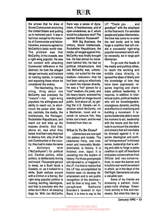 2) It argues that the Libertarian Party has become irrelevant and dominated by moderates, and libertarians should instead help build a new right-wing populist movement that incorporates paleoconservative ideas and can mobilize grassroots support.
