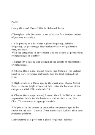 The document provides detailed instructions on how to use Microsoft Excel 2010 for various data visualization and analysis tasks, including creating bar charts, pie charts, histograms, and line graphs from qualitative and quantitative data. It also covers statistical functions for summary measures such as mean, median, and standard deviation, as well as methods for analyzing binomial and normal distributions. Additional instructions include using the descriptive statistics tool and determining covariance or correlation coefficients from data sets.