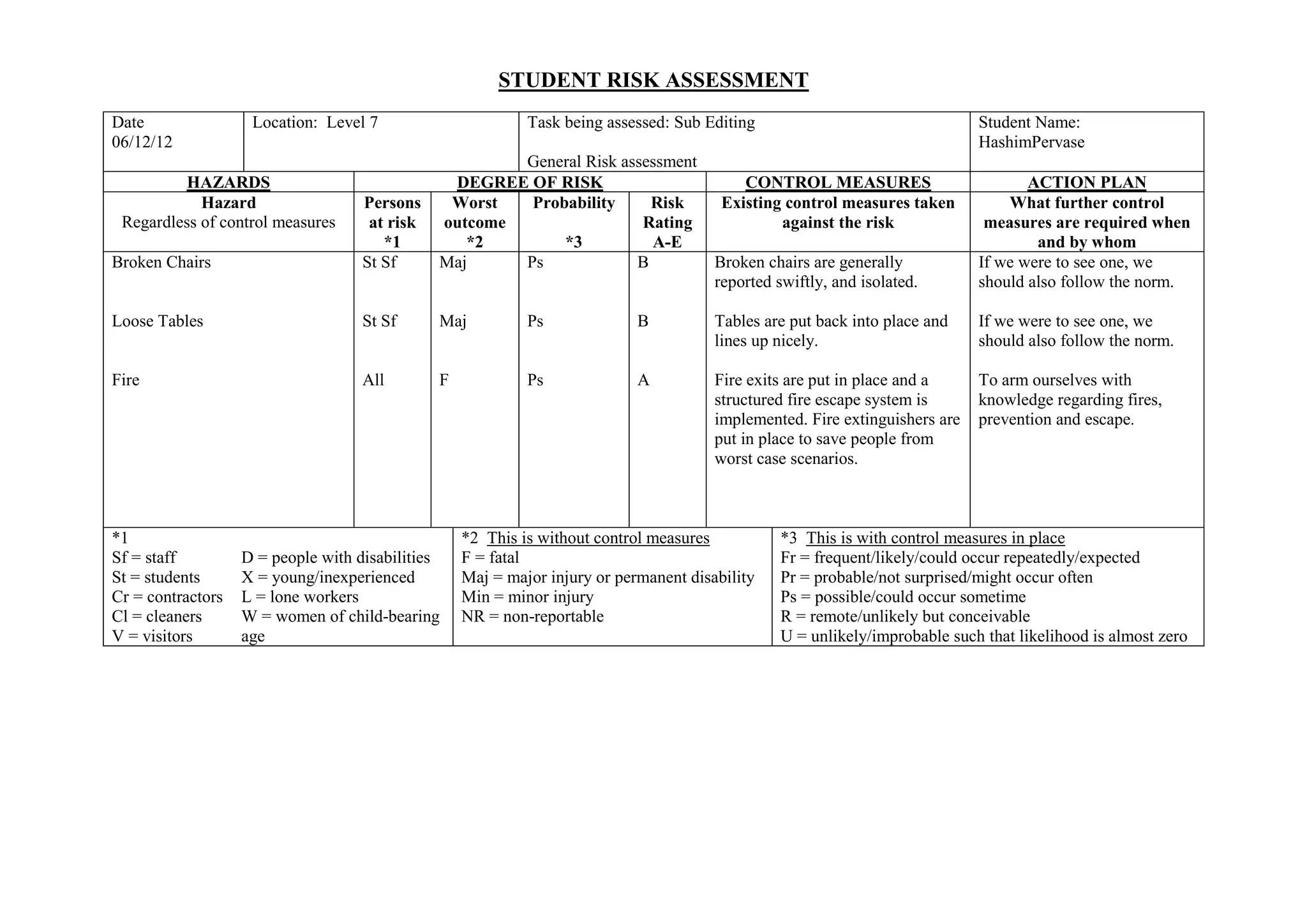 The documents summarize risk assessments for a student named Hashim Pervase conducting various tasks. Fires pose the highest risk rated A. Broken chairs and loose tables also pose risks rated B. Control measures aim to quickly report and isolate broken furniture. Further actions include following protocols and having first aid kits accessible. Collisions in markets could cause minor injury but are rated C with care taken to avoid accidents.