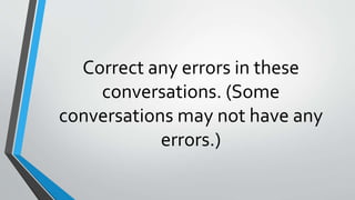 This document contains examples of conversations with errors and their corrections. The errors involve incorrect verb tenses, including using the present tense when the present perfect tense is needed to indicate an action that began in the past and continues in the present. The examples demonstrate how to identify verb tense errors and apply the proper verb form, such as using the present perfect tense with time expressions like "since" that refer to an ongoing situation from the past leading up to the present.