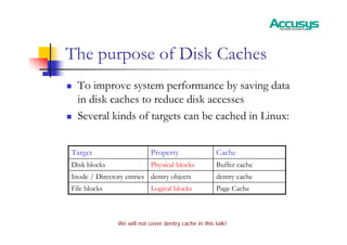 The document discusses disk caches in Linux, including: