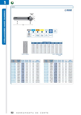 2575 AVELLANADORES MANGO CILÍNDRICO Aplicación D < 850 INOX Cu Al Plástico N/mm2 DIN HSS 335 C Tol. D Tol. Tol. 0 Tol.Y-1 3Z (± 0,05) d (h9) L (± 1) 90° Vc - Cs Avances mm/rev. HSS Ø6 Ø8 Ø 10 Ø 16 Ø 20 Ø 25 Ø 32 Ø 40 15-20 0,060 0,080 0,100 0,120 0,150 0,180 0,200 0,220 4-8 0,040 0,050 0,060 0,080 0,100 0,120 0,140 0,160 4-8 0,030 0,040 0,050 0,060 0,080 0,090 0,100 0,120 20-30 0,060 0,080 0,100 0,120 0,150 0,180 0,200 0,220 15-25 0,090 0,110 0,130 0,160 0,190 0,210 0,260 0,290 15-25 0,090 0,110 0,130 0,160 0,190 0,210 0,260 0,290 8-12 0,090 0,110 0,130 0,160 0,190 0,210 0,260 0,290 20-30 0,100 0,120 0,150 0,180 0,200 0,220 0,280 0,320 Vc-Cs = m/mín. r.p.m. = Vc/Cs x 1.000 πxø Ref. Código Ø mm Ø mm Ø d L Aplic. Ref. Código Ø mm Ø mm Ø d L Aplic. HSS HSS mayor menor mm mm máx/mín. HSS HSS mayor menor mm mm máx/mín. 0111700 74653 4,30 1,30 4 40 1,5/4,3 0111713 74666 11,50 2,80 8 56 3,0/11,4 0111701 74654 5,00 1,50 4 40 2,0/5,0 0111714 74667 12,40 2,80 8 56 3,0/12,4 0111702 74655 5,30 1,50 4 40 2,0/5,3 0111715 74668 13,40 2,90 8 56 3,0/13,4 0111703 74656 5,80 1,50 5 45 2,0/5,8 0111716 74669 15,00 3,20 10 60 4,0/15,0 0111704 74657 6,00 1,50 5 45 2,0/6,0 0111717 74670 16,50 3,20 10 60 4,0/16,5 0111705 74658 6,30 1,50 5 45 2,0/6,3 0111718 74671 19,00 3,50 10 63 4,0/19,0 0111706 74659 7,00 1,80 6 45 2,0/7,0 0111719 74672 20,50 3,50 10 63 4,0/20,5 0111707 74660 7,30 1,80 6 45 2,0/7,3 0111720 74673 23,00 3,80 10 67 4,0/23,0 0111708 74661 8,00 2,00 6 45 2,5/8,0 0111721 74674 25,00 3,80 10 67 4,0/25,0 0111709 74662 8,30 2,00 6 45 2,5/8,3 0111722 42714 28,00 4,00 12 71 4,5/28,0 0111710 74663 9,40 2,20 6 45 3,0/9,4 0111723 12588 30,00 4,20 12 71 4,5/31,0 0111711 74664 10,00 2,50 6 45 3,0/10,0 0111724 42715 31,00 4,20 12 71 4,5/31,0 0111712 74665 10,40 2,50 6 50 3,0/10,4 0111725 11061 40,00 5,00 15 80 5,5/40,0 52 H E R R A M I E N T A D E C O R T E