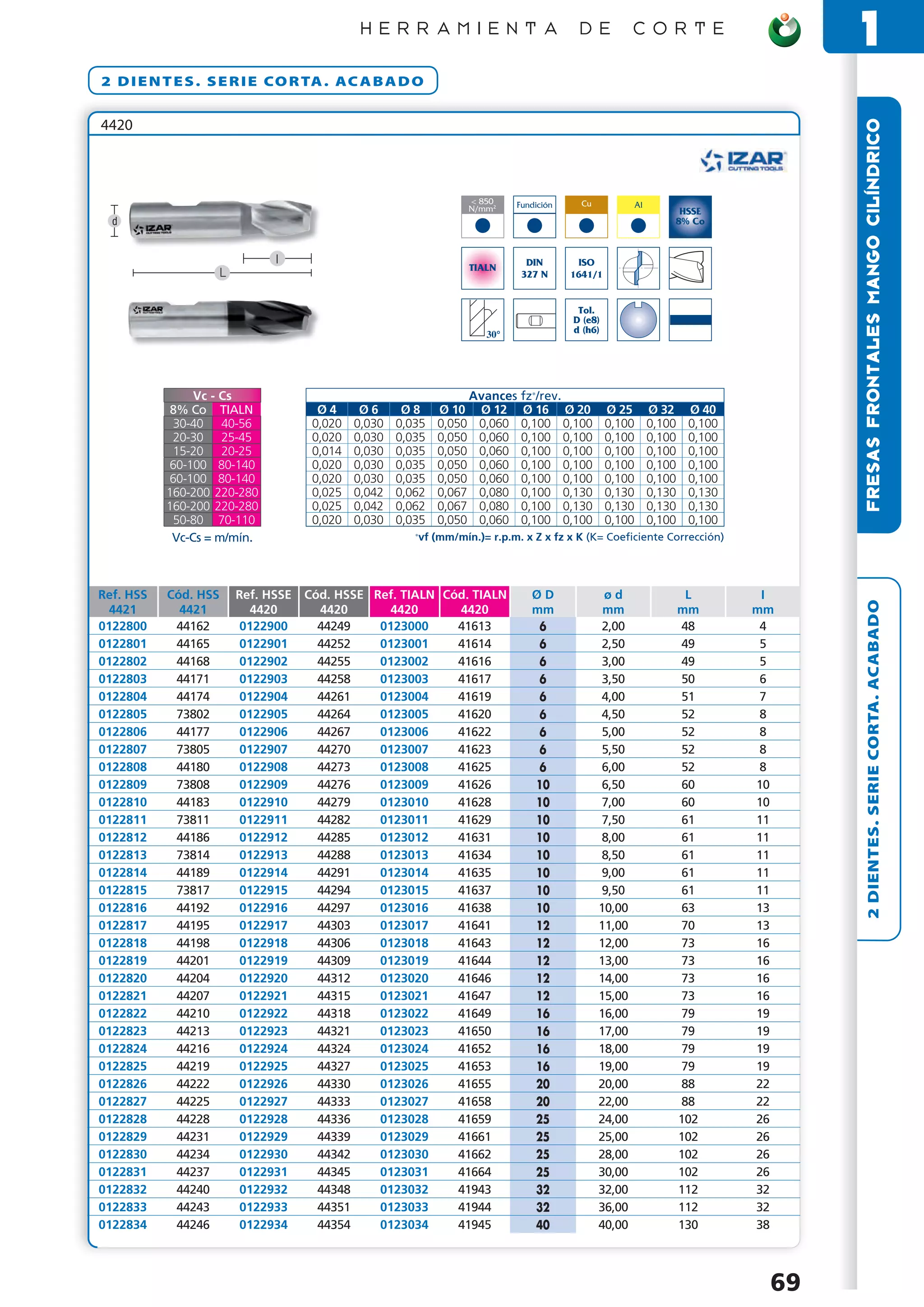 R A M I E N T A D E C O R T E 1 2 D I E N T E S . S E R I E CO R TA . AC A B A D O 4420 FRESAS FRONTALES MANGO CILÍNDRICO < 850 Fundición Cu Al N/mm2 HSSE d 8% Co DIN ISO TIALN 327 N 1641/1 Tol. D (e8) d (h6) Vc - Cs Avances fz∗/rev. 8% Co TIALN Ø4 Ø6 Ø8 Ø 10 Ø 12 Ø 16 Ø 20 Ø 25 Ø 32 Ø 40 30-40 40-56 0,020 0,030 0,035 0,050 0,060 0,100 0,100 0,100 0,100 0,100 20-30 25-45 0,020 0,030 0,035 0,050 0,060 0,100 0,100 0,100 0,100 0,100 15-20 20-25 0,014 0,030 0,035 0,050 0,060 0,100 0,100 0,100 0,100 0,100 60-100 80-140 0,020 0,030 0,035 0,050 0,060 0,100 0,100 0,100 0,100 0,100 60-100 80-140 0,020 0,030 0,035 0,050 0,060 0,100 0,100 0,100 0,100 0,100 160-200 220-280 0,025 0,042 0,062 0,067 0,080 0,100 0,130 0,130 0,130 0,130 160-200 220-280 0,025 0,042 0,062 0,067 0,080 0,100 0,130 0,130 0,130 0,130 50-80 70-110 0,020 0,030 0,035 0,050 0,060 0,100 0,100 0,100 0,100 0,100 Vc-Cs = m/mín. ∗ vf (mm/mín.)= r.p.m. x Z x fz x K (K= Coeficiente Corrección) Ref. HSS Cód. HSS Ref. HSSE Cód. HSSE Ref. TIALN Cód. TIALN ØD ød L I 2 DIENTES. SERIE CORTA. ACABADO 4421 4421 4420 4420 4420 4420 mm mm mm mm 0122800 44162 0122900 44249 0123000 41613 6 2,00 48 4 0122801 44165 0122901 44252 0123001 41614 6 2,50 49 5 0122802 44168 0122902 44255 0123002 41616 6 3,00 49 5 0122803 44171 0122903 44258 0123003 41617 6 3,50 50 6 0122804 44174 0122904 44261 0123004 41619 6 4,00 51 7 0122805 73802 0122905 44264 0123005 41620 6 4,50 52 8 0122806 44177 0122906 44267 0123006 41622 6 5,00 52 8 0122807 73805 0122907 44270 0123007 41623 6 5,50 52 8 0122808 44180 0122908 44273 0123008 41625 6 6,00 52 8 0122809 73808 0122909 44276 0123009 41626 10 6,50 60 10 0122810 44183 0122910 44279 0123010 41628 10 7,00 60 10 0122811 73811 0122911 44282 0123011 41629 10 7,50 61 11 0122812 44186 0122912 44285 0123012 41631 10 8,00 61 11 0122813 73814 0122913 44288 0123013 41634 10 8,50 61 11 0122814 44189 0122914 44291 0123014 41635 10 9,00 61 11 0122815 73817 0122915 44294 0123015 41637 10 9,50 61 11 0122816 44192 0122916 44297 0123016 41638 10 10,00 63 13 0122817 44195 0122917 44303 0123017 41641 12 11,00 70 13 0122818 44198 0122918 44306 0123018 41643 12 12,00 73 16 0122819 44201 0122919 44309 0123019 41644 12 13,00 73 16 0122820 44204 0122920 44312 0123020 41646 12 14,00 73 16 0122821 44207 0122921 44315 0123021 41647 12 15,00 73 16 0122822 44210 0122922 44318 0123022 41649 16 16,00 79 19 0122823 44213 0122923 44321 0123023 41650 16 17,00 79 19 0122824 44216 0122924 44324 0123024 41652 16 18,00 79 19 0122825 44219 0122925 44327 0123025 41653 16 19,00 79 19 0122826 44222 0122926 44330 0123026 41655 20 20,00 88 22 0122827 44225 0122927 44333 0123027 41658 20 22,00 88 22 0122828 44228 0122928 44336 0123028 41659 25 24,00 102 26 0122829 44231 0122929 44339 0123029 41661 25 25,00 102 26 0122830 44234 0122930 44342 0123030 41662 25 28,00 102 26 0122831 44237 0122931 44345 0123031 41664 25 30,00 102 26 0122832 44240 0122932 44348 0123032 41943 32 32,00 112 32 0122833 44243 0122933 44351 0123033 41944 32 36,00 112 32 0122834 44246 0122934 44354 0123034 41945 40 40,00 130 38 69