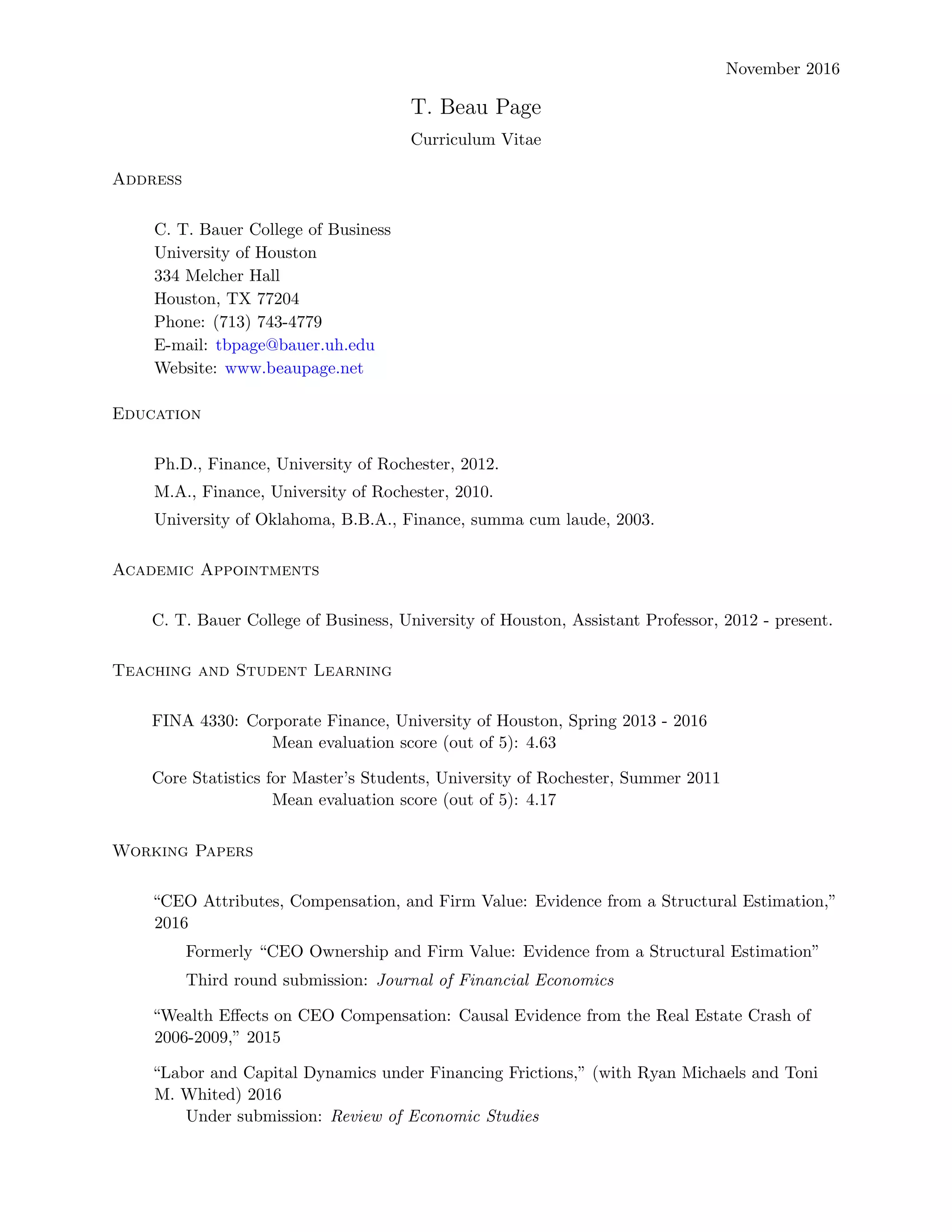 This document is a curriculum vitae for T. Beau Page. It summarizes his education, including a Ph.D. in Finance from the University of Rochester in 2012. It lists his current position as an Assistant Professor at the University of Houston since 2012. It provides details on his teaching evaluations and working papers on topics related to CEO compensation and firm value. It also lists presentations given at various universities and conferences.
