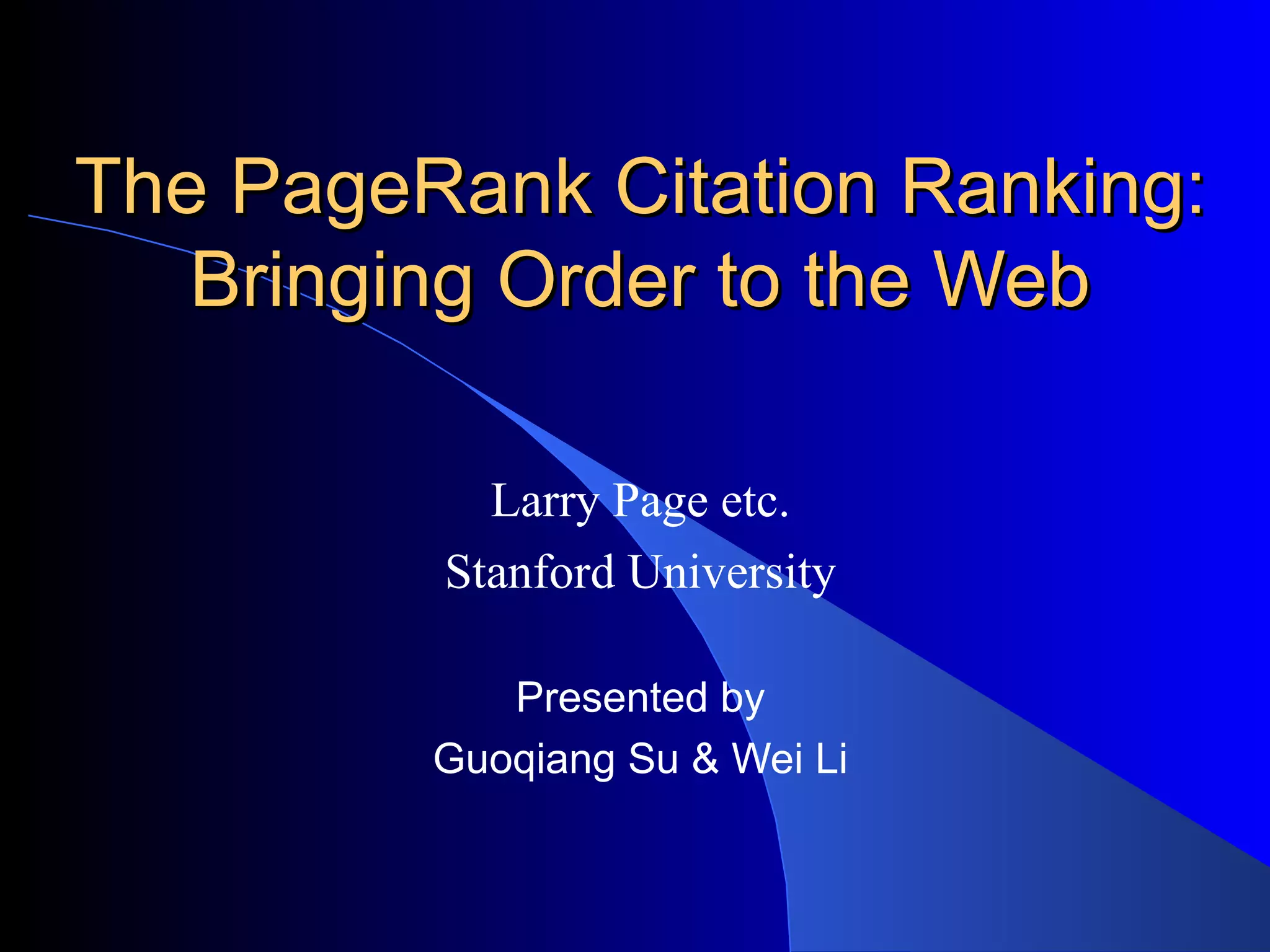 The document introduces PageRank, an algorithm developed by Larry Page for ranking web pages. It discusses the motivation for developing PageRank to bring order to the unstructured web. It provides an overview of how PageRank models the random surfing behavior of users to determine the importance of pages based on both the number and quality of backlinks. It also summarizes some implementations and applications of PageRank, as well as limitations and areas for further refinement.