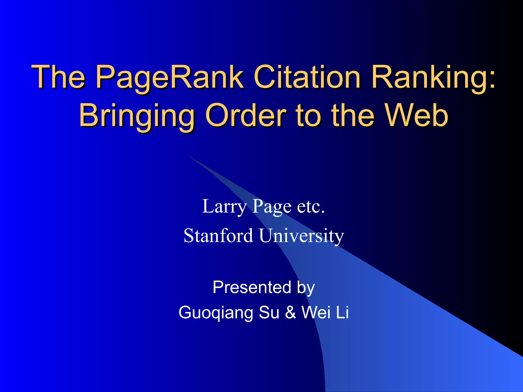 The document introduces PageRank, an algorithm developed by Larry Page for ranking web pages. It discusses the motivation for developing PageRank to bring order to the unstructured web. It provides an overview of how PageRank models the random surfing behavior of users to determine the importance of pages based on both the number and quality of backlinks. It also summarizes some implementations and applications of PageRank, as well as limitations and areas for further refinement.