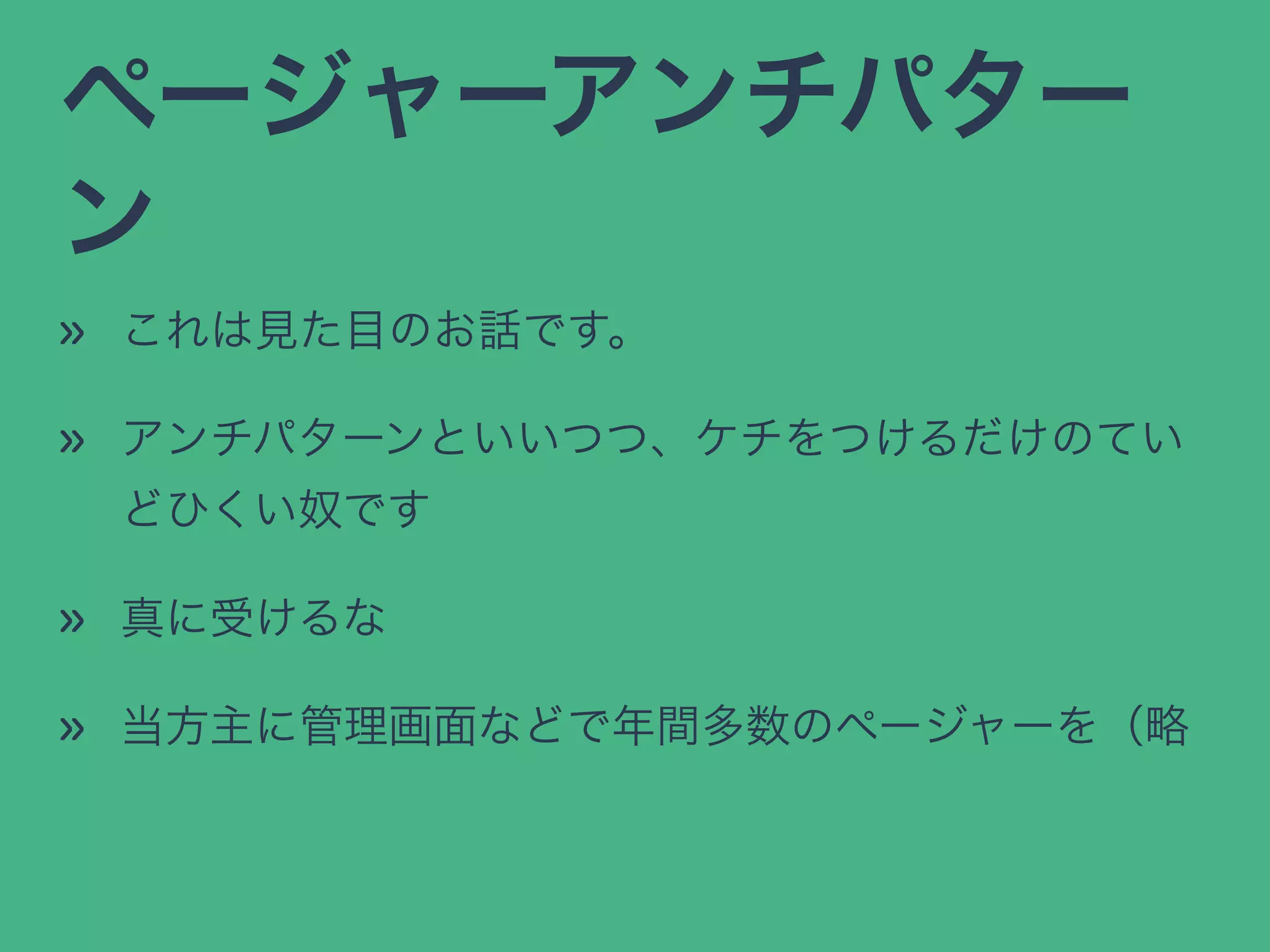 デフォルトが致命的にすくない件数つらい » 変更をおぼえてくれない(Cookieとかで…) » 10 50 100 件の秘伝のタレ感 » キャッシュ効率悪くて死ぬ