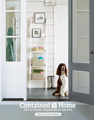 The document advertises the services of Contained Home Organizers, who help organize homes and create organized oasis spaces tailored to individual lifestyles. They bring expert advice, products, and solutions to transform spaces. Their solutions are effective and easy to maintain. Services include organizing closets, home offices, kids' rooms, and more. They develop customized organization plans through in-home consultations and installations. Ongoing organization maintenance is also available.