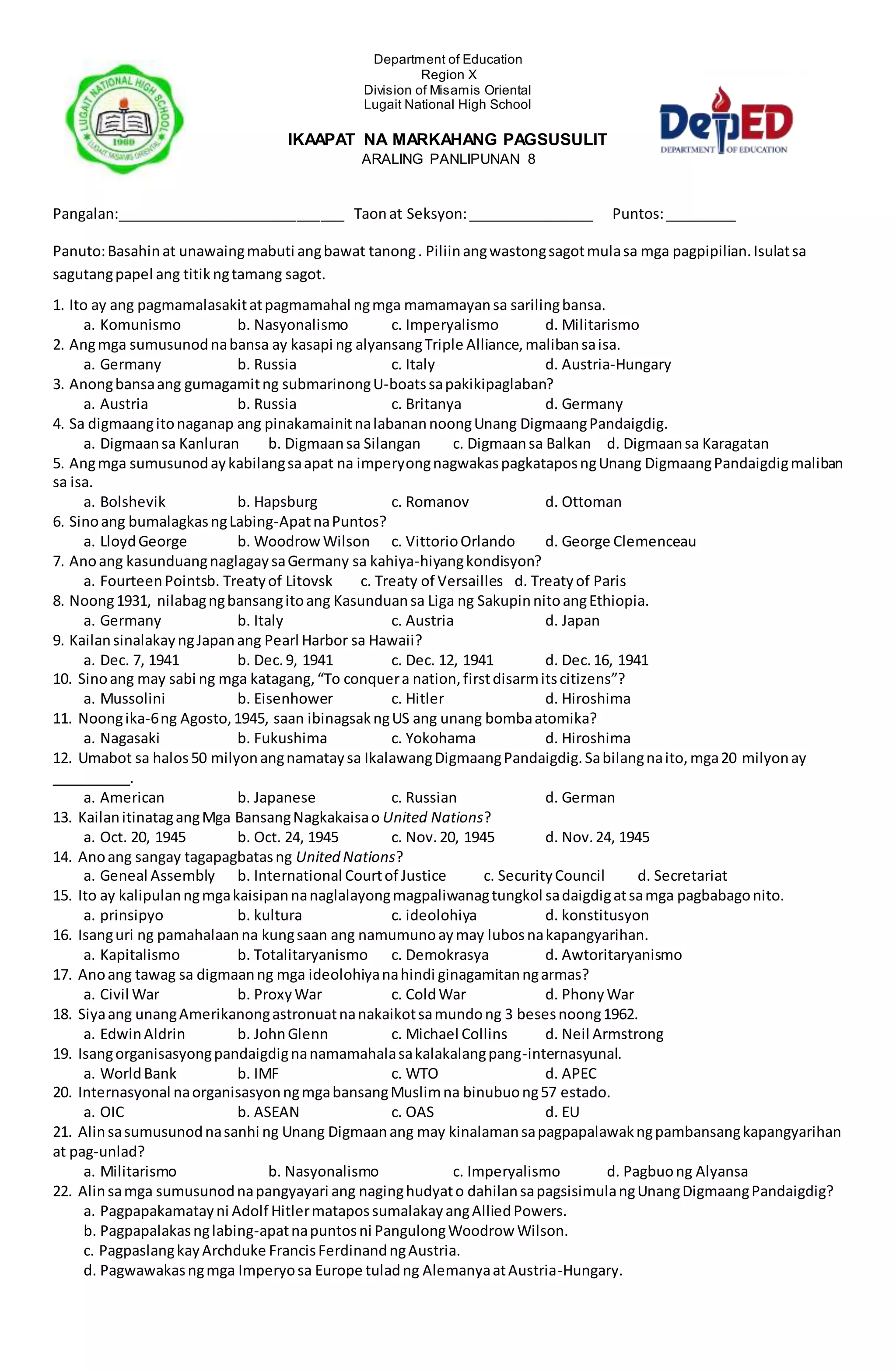 Ang dokumento ay isang pagsusulit sa Araling Panlipunan para sa ikaapat na markahan ng mga mag-aaral sa Lugait National High School. Ang pagsusulit ay naglalaman ng 50 tanong tungkol sa kasaysayan, mga digmaan, at pandaigdigang ugnayan. Ang mga tanong ay may mga pagpipiliang sagot na dapat piliin ng mga estudyante.