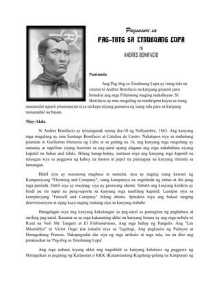Ang 'Pag-ibig sa Tinubuang Lupa' ay isang tula na isinulat ni Andres Bonifacio upang himukin ang mga Pilipino na maging makabayan. Itinatampok ng tula ang kanyang pag-ibig sa kanyang bayan at ang mga sakripisyo ng mga Pilipino sa ilalim ng pananakop ng mga Kastila. Ang mga ideya sa tula ay naglalaman ng mga hinaing at paghihirap ng mga tao, na nagpapakita ng makabayang damdamin na nag-udyok sa kanya sa pakikibaka para sa kalayaan.