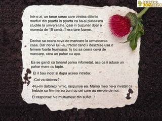 Un tânăr sărăcit a cerut un pahar cu apă, dar a primit lapte de la o femeie bună, care l-a ajutat să-și continue studiile. Ani mai târziu, ajunge medic și îi salvează viața acelei femei bolnave, fără să știe că este ea. La final, îi trimite factura medicală cu mesajul că aceasta a fost plătită cu paharul de lapte primit anterior, evidențiind astfel principiul că faptele bune se întorc la cel care le face.