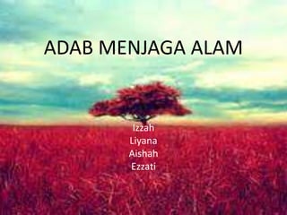 Dokumen ini membincangkan adab menjaga alam sekitar yang merupakan kurniaan Allah s.w.t. untuk manusia. Pencemaran alam yang disebabkan oleh sikap tidak bertanggungjawab manusia seperti pencemaran udara, air, tanah, dan bunyi menyebabkan kerosakan yang teruk. Langkah untuk mengatasi pencemaran termasuk menanam kesedaran masyarakat dan penguatkuasaan undang-undang.