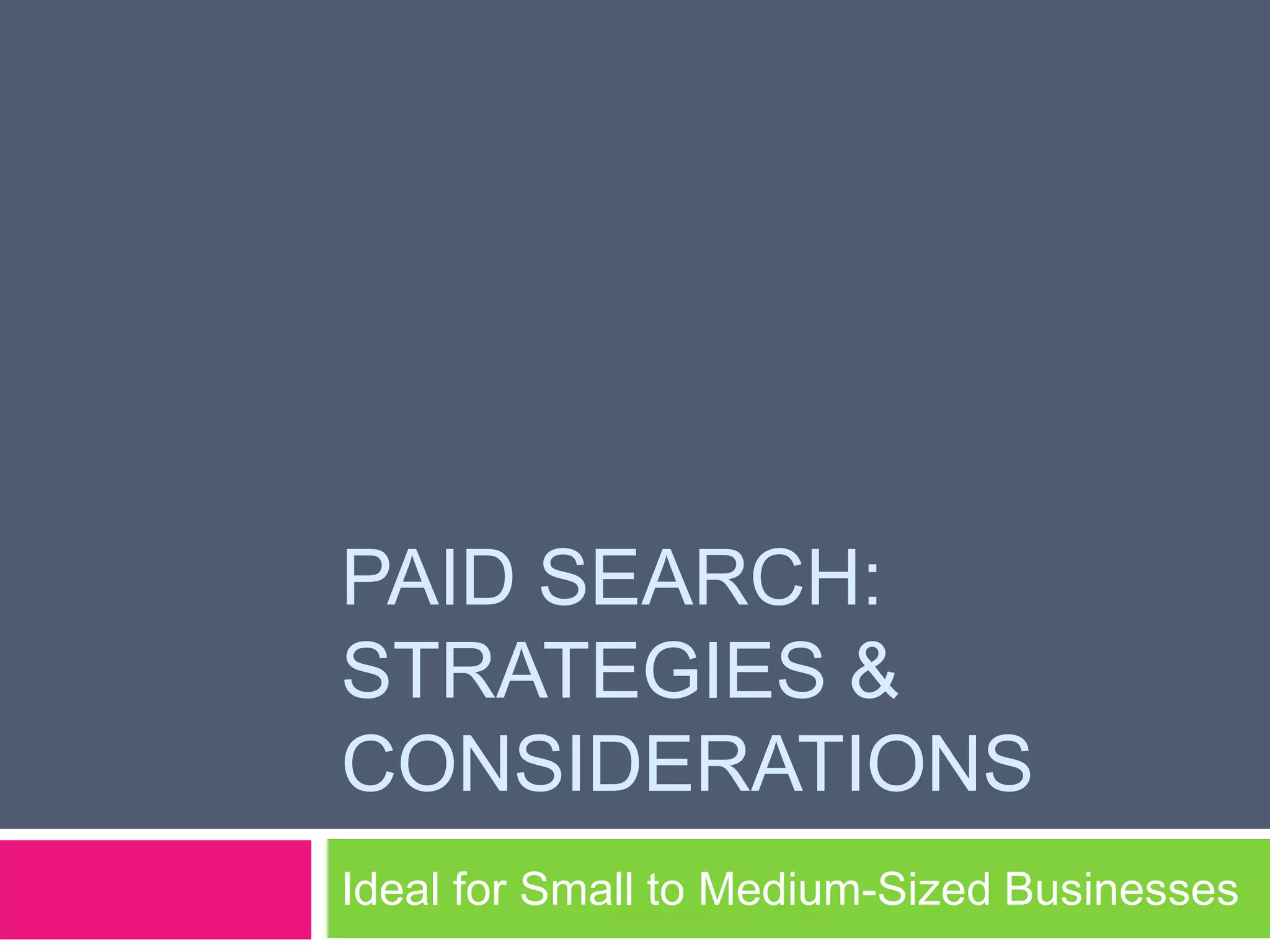 This document provides guidance on setting up an effective paid search campaign for small to medium-sized businesses. It discusses assessing business goals, performing keyword research, creating optimized ad groups and campaigns, writing effective ad copy, setting appropriate bids and campaign settings, monitoring performance, and testing strategies to improve results over time. The goal is to help businesses get the most out of their paid search marketing spend by focusing on quality scores, low costs per click, and driving profitable conversions and sales.