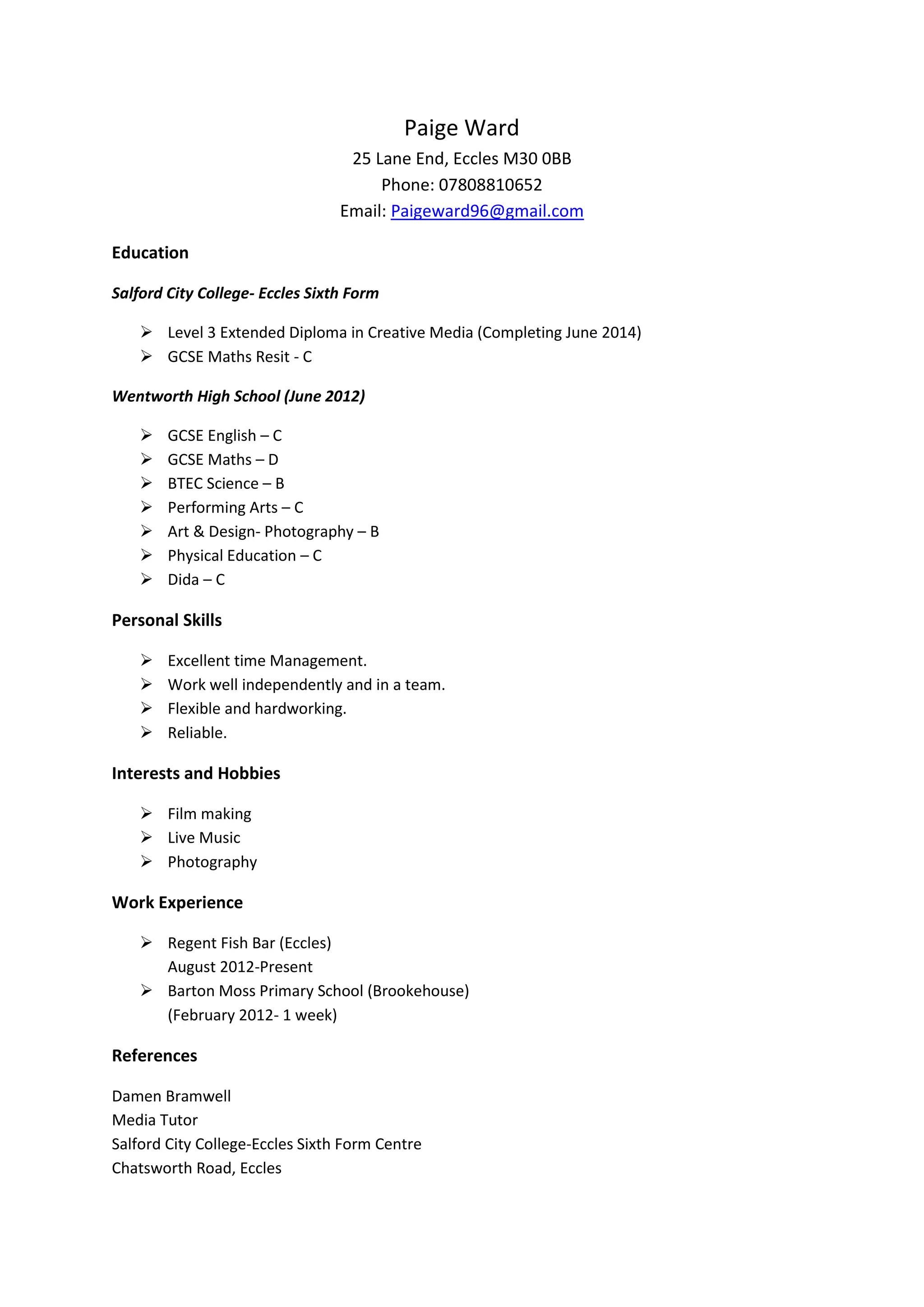 Paige Ward is a student completing her Level 3 Extended Diploma in Creative Media at Salford City College in June 2014. She attended Wentworth High School from 2012-2014, achieving GCSEs grades C-D. Paige has excellent time management and works well independently and in a team. Her interests include filmmaking, live music, and photography. She has work experience at Regent Fish Bar since 2012 and did a week's work experience at Barton Moss Primary School in 2012. Her references are her media tutor at college and her former head of year at high school.