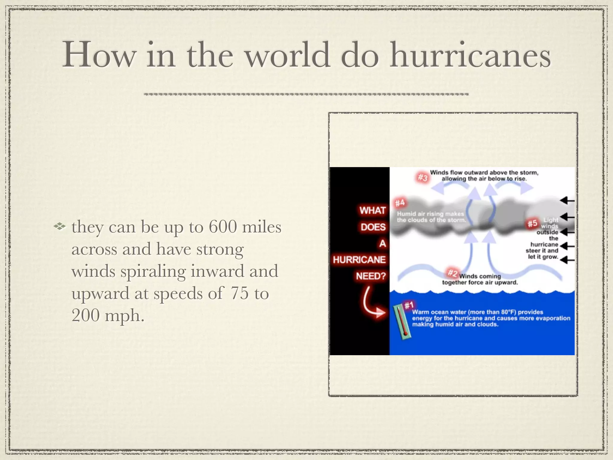 Hurricanes can be up to 600 miles wide with winds spiraling inward at 75-200 mph. Unlike extropical cyclones, hurricanes have warm air at their center. The worst hurricane was Hurricane Andrew in 1992, which started in the Atlantic and hit the Bahamas and Florida with winds up to 175 mph, crossing Florida before strengthening over the Gulf of Mexico. The eye of the hurricane is the calmest part in the center with light winds and no rain.
