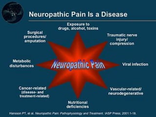 The document discusses pain perception and transmission in the human body. It begins by defining pain and outlining the dual sensory and emotional nature of pain. It then describes how pain signals are transmitted from nociceptors to the spinal cord and brain through A and C nerve fibers. The signals travel through the spinothalamic tract to the thalamus and somatosensory cortex. Descending pathways from the brain can modulate pain perception. The gate control theory of pain is also explained. The document further discusses different types of pain and factors that influence pain experience.