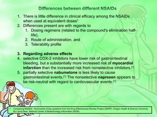 This document discusses pain and its treatment. It begins by defining pain and classifying common types of pain conditions. It then discusses the body's reflex responses to pain and the endorphin system that modulates pain. It describes the differences between acute and chronic pain and methods of pain measurement. Various treatment options are provided for different types of pain, including NSAIDs, opioids, tramadol, tapentadol, muscle relaxants, and sodium channel blockers. Newer treatments discussed include epirisone and the comparative properties of different NSAIDs, muscle relaxants, tramadol, and tapentadol. Key questions are also provided about comparing treatment effectiveness and safety across patient subgroups.