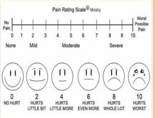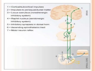 This document discusses pain anatomy and physiology. It defines pain as an unpleasant sensory and emotional experience associated with tissue damage. Nociception is the process by which nociceptors detect and transmit signals of potential tissue damage to the brain. There are different types of nociceptors and pain fibers that detect fast, sharp pain or slow, dull pain. The ascending pain pathway involves three neurons that transmit nociceptive signals from receptors to the spinal cord and thalamus. The gate control theory proposes that non-painful input can close the "gates" and inhibit pain transmission.
