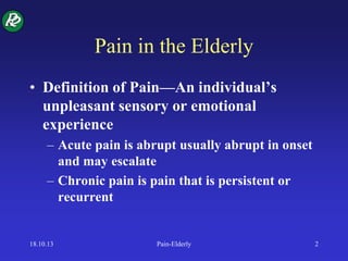 Pain is common in elderly patients due to age-related changes in peripheral nerves and the central nervous system. Chronic pain is prevalent, with about 1 in 5 elderly patients experiencing pain for over 24 hours in the past month. Common causes of pain include arthritis, fractures, and neuropathies. Untreated pain can lead to depression, sleep disturbances, functional impairment, and reduced quality of life. Treatment involves both pharmacological and non-pharmacological approaches, with special considerations for age-related changes impacting drug metabolism and side effects.