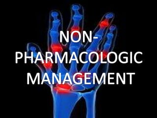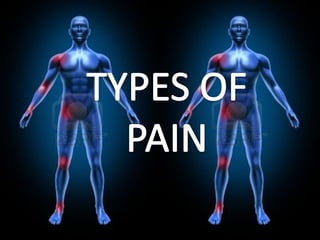 This document provides an overview of pain, including definitions, classifications, physiology, assessment, and management. It defines pain as an unpleasant sensory and emotional experience associated with actual or potential tissue damage. Pain is classified based on location, duration (acute vs chronic), and intensity (mild, moderate, severe). The physiology of pain involves transduction, transmission, modulation, and perception of pain signals in the nervous system. Nurses assess pain using scales and treat it using pharmacological and non-pharmacological methods based on the type and severity of the pain.